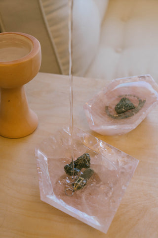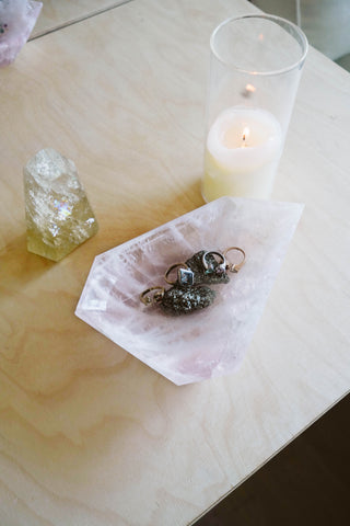 Rose Quartz, with its gentle loving energy, creates the perfect sanctuary for your treasures at night. When you intuitively feel your jewelry needs deeper cleansing, place a raw pyrite stone with your pieces in the ritual bowl and fill with fresh water. Allow them to rest for 2-3 hours maximum, then wear them cleansed and recharged, ready to serve you.