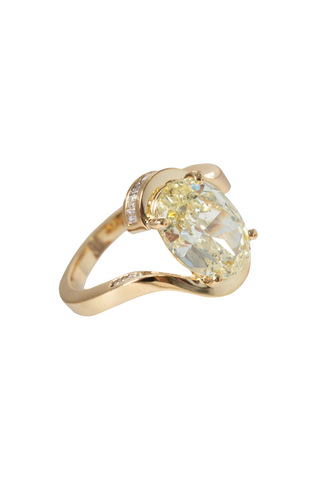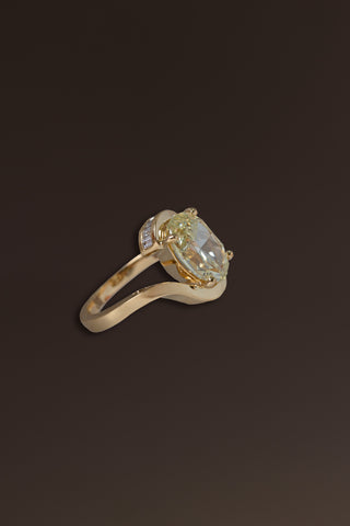 In one reading, dragon energy emerged for the couple. Dragon Energy symbolizes mother energy, power, ancient wisdom and magick. This inspired a design where a yellow diamond became the dragon's eye and a hidden ruby symbolized the mother energy. With each piece comes a reading revealing profound symbolism, entirely unique to each couple's journey.